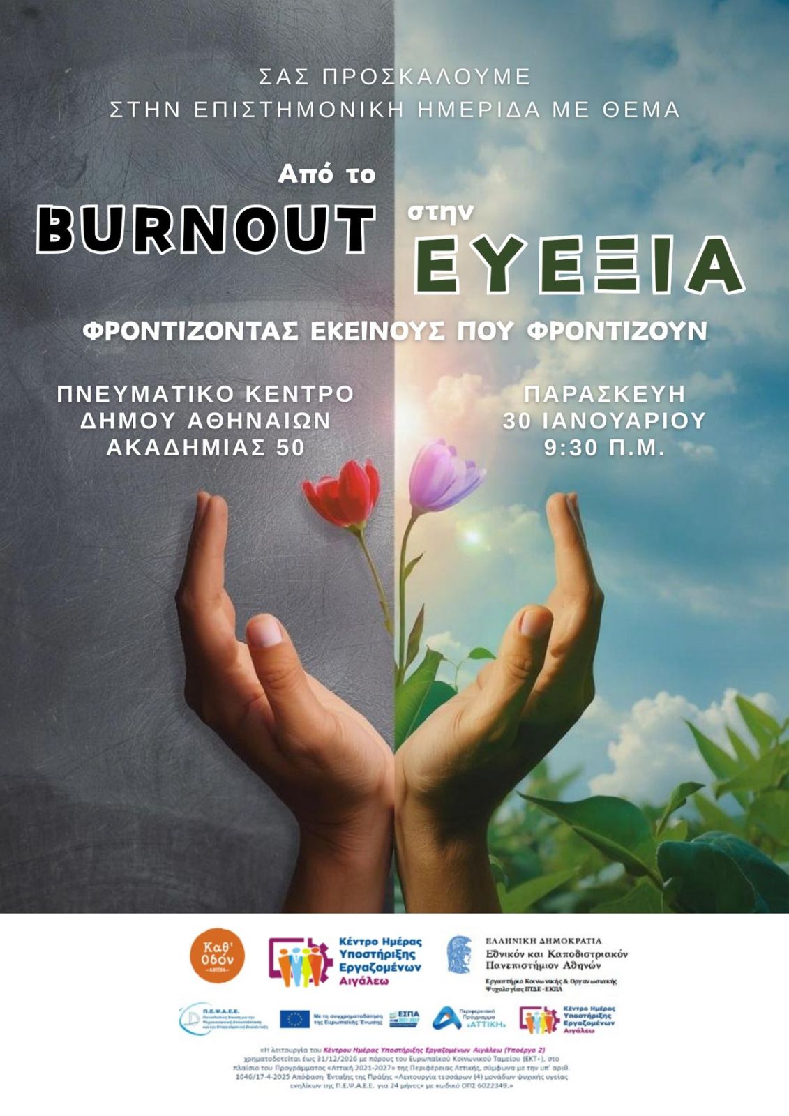 Το Κέντρο Ημέρας Υποστήριξης Εργαζομένων Αιγάλεω της ΠΕΨΑΕΕ και η ΑΜΚΕ «Καθ’ οδόν», με την επιστημονική υποστήριξη του Εργαστηρίου Κοινωνικής και Οργανωσιακής Ψυχολογίας του ΕΚΠΑ, συνδιοργανώνουν επιστημονική ημερίδα με θέμα: